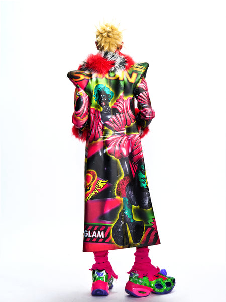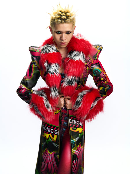 LONG GRAPHIC LEATHER JACKET WITH DETACHABLE FAUX FUR COLLAR
